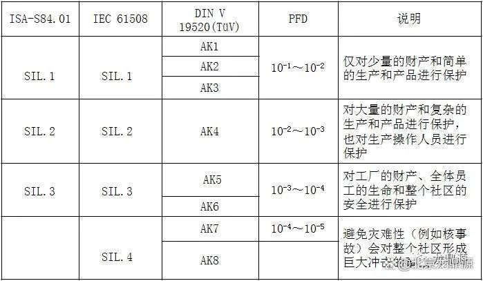 আইইসি স্ট্যান্ডার্ড অনুসারে, এটি CIL1-SIL4 এ নিম্ন থেকে উচ্চ, আইএসএ 84.01 থেকে এসআইএল 1-সিল 3 এবং ডিআইএন ভি ভিডিই 0804 অনুযায়ী নিম্ন থেকে উচ্চতর এ কে 1-এআই 8 এ বিভক্ত। তাদের মধ্যে সম্পর্কিত সম্পর্ক নিম্নরূপ।